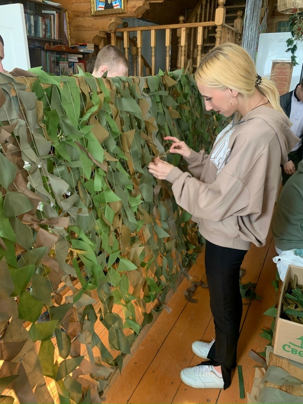 солдатам. Сегодня преподаватели Денисова Н.Г., Шамонина Н.Н., студенты гр. ТА-1, МП/МДД-1 посетили духовный центр при храме Иоанна Кронштадтского и приняли участие в плетении маскировочных сетей для СВО.